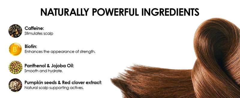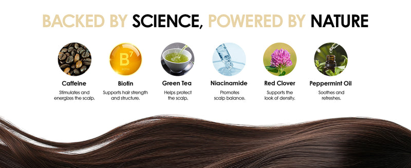 Simmondsia Chinensis Seed Oil, Coco-Caprylate, Glycerin, Oleyl Erucate, Biotin, Cucurbita Pepo Seed Extract, Serenoa Serrulata Fruit Extract, Urea, Emblica Officinalis Fruit Extract, Caffeine, Acetyl Tetrapeptide-3, Trifolium Pratense Flower Extract, Tocopheryl Acetate, Malic Acid, Salicylic Acid, Tocopherol, Mentha Piperita Oil, Disodium Phosphate, Panthenol, Lactic Acid, Citric Acid, Helianthus Annuus Seed Oil, Butylene Glycol, Menthol, Dextran, Isopropyl Alcohol, Acrylates/C10-30 Alkyl Acrylate Crosspolymer, Benzyl Alcohol, Dehydroacetic Acid, Sodium Benzoate, Potassium Sorbate.